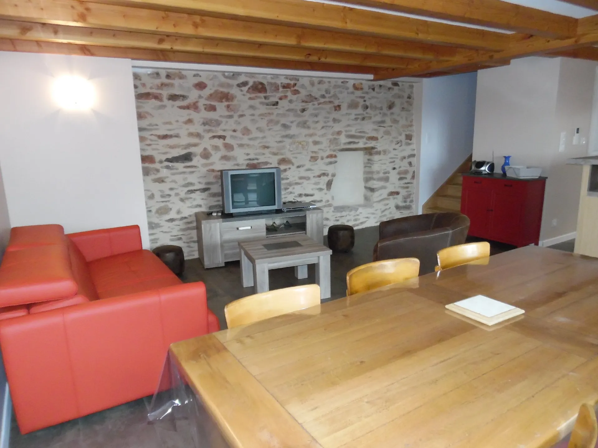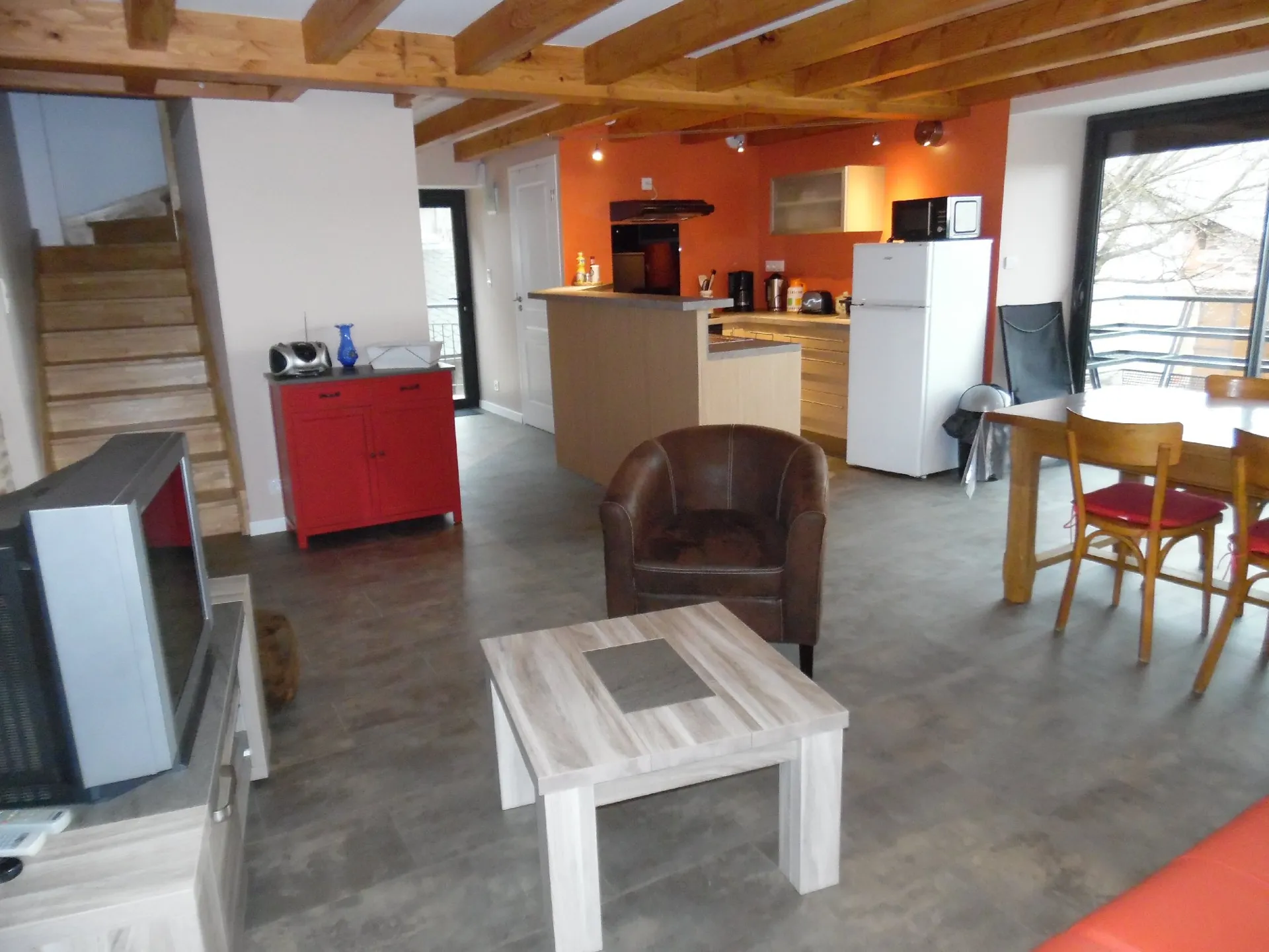 Gîte 5 à 7 personnes classé en 3 étoiles. Deux chambres, deux salles de bain, WC indépendant, belle pièce à vivre avec salon, salle à manger, cuisine entièrement équipée, terrasse et balcon, garage. Situé au coeur du village à l’étage d’une ancienne grange entièrement rénovée. Vente de produits du terroir, bar, café et salon de thé au rez-de-chaussée. Possibilité petit-déjeuner et panier pique-nique.